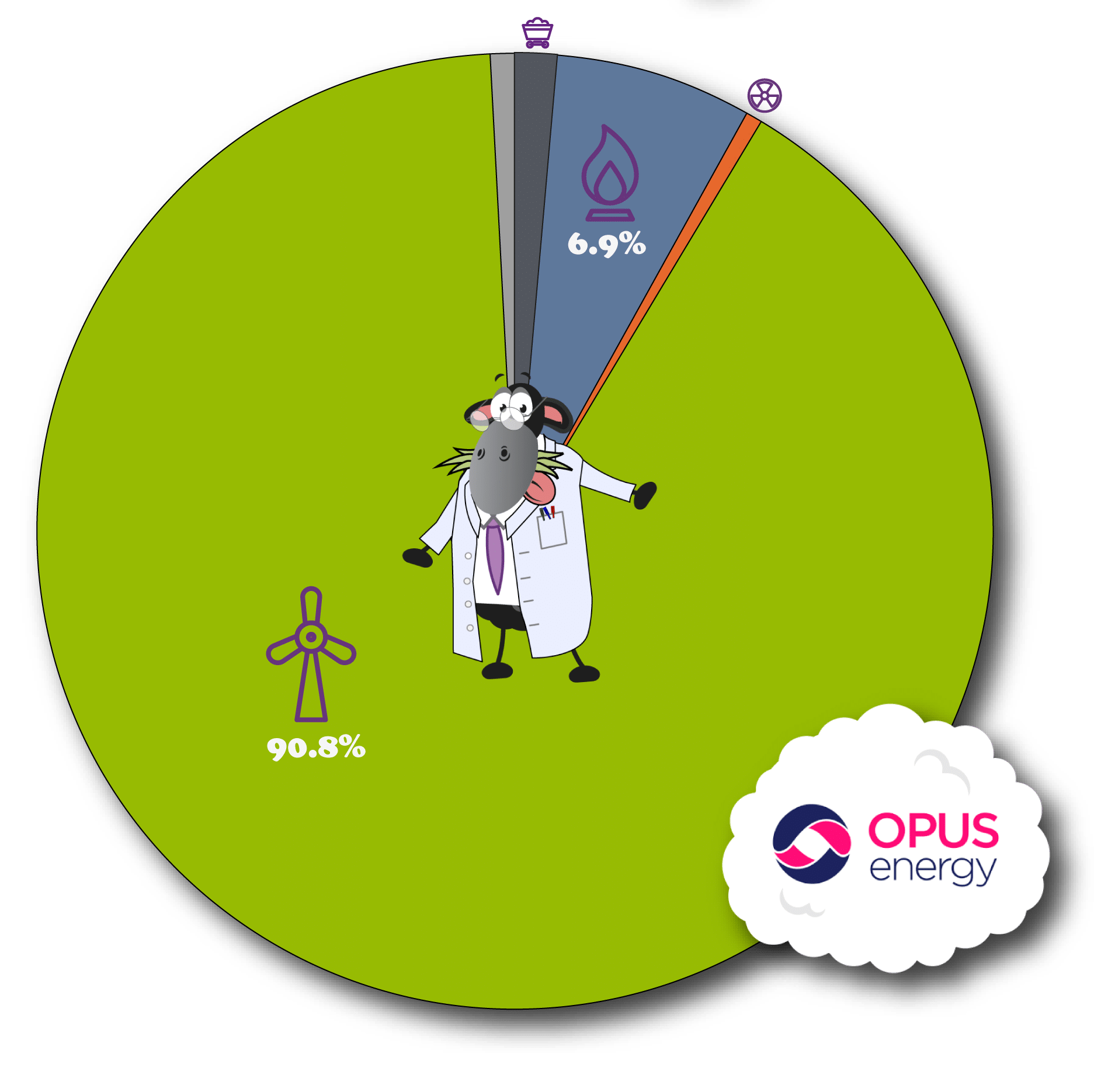 The current Opus Energy Supply Fuel Mix is 1.4% Coal, 6.9% Natural Gas, 0.4% Nuclear, 90.8% Renewable and 0.6% Other Fuel Sources.