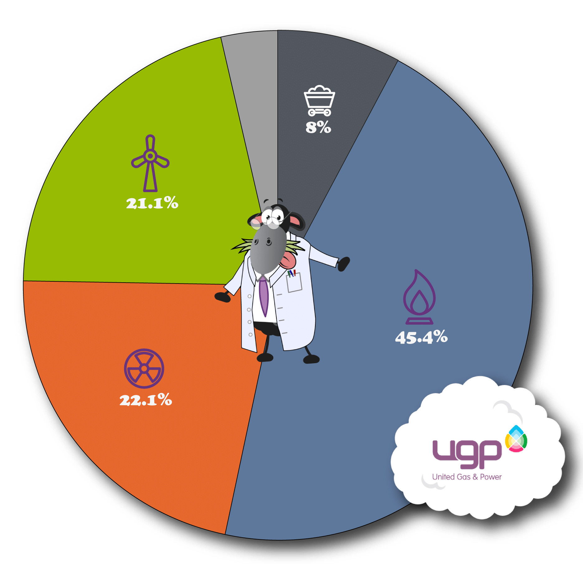 The current United Gas and Power’s Fuel Mix consists of 8% Coal, 45.4% Natural Gas, 22.1% Nuclear, 21.1% Renewable and 3.4% Other Fuel Sources.